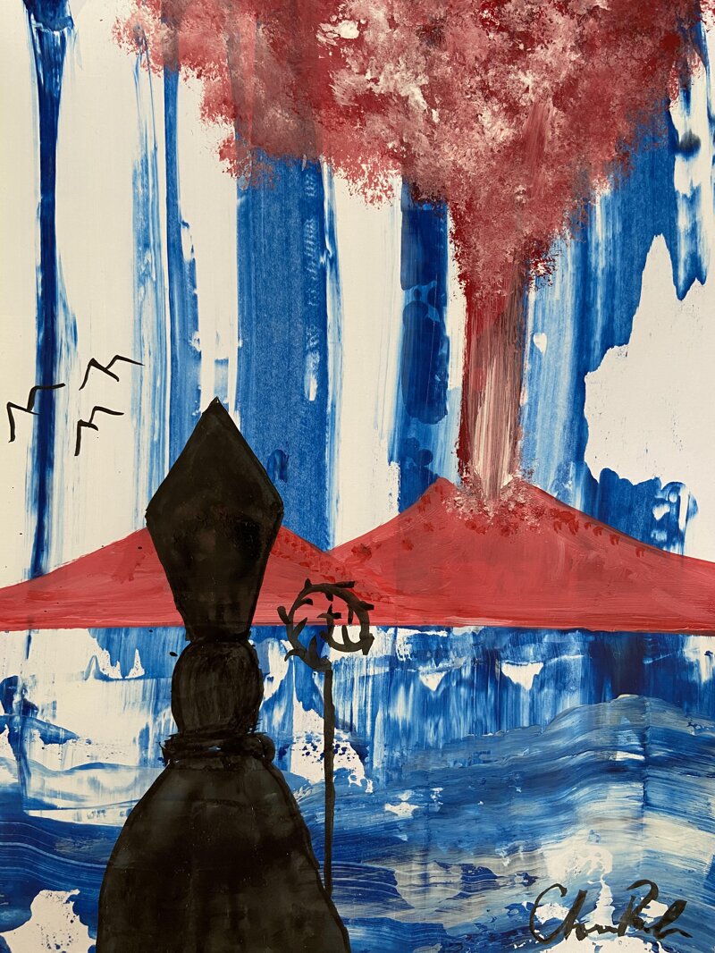 Il santo patrono vigila su un Vesuvio in piena. Eseguito in data 02/05/2020 giorno in cui è avvenuto il miracolo di San Gennaro nel Duomo di Napoli. Il sangue nell’ampolla si è sciolto miracolosamente. Lo stesso colore del Vesuvio.