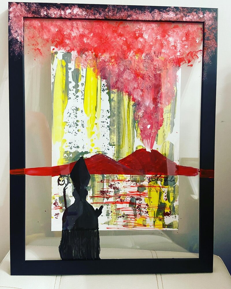 “L’eruzione si è estesa sul vetro fino a lambire la cornice; San Gennaro e il Vesuvio hanno rotto gli argini della tela per contenere l’esplosione.”