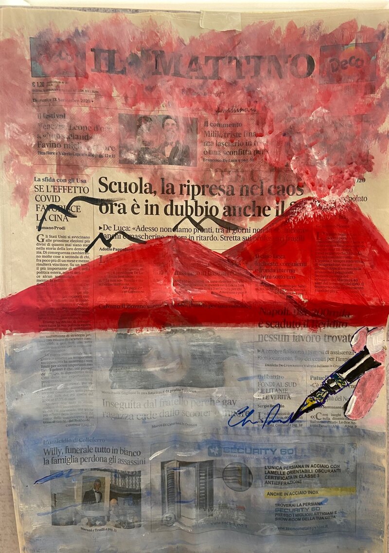 Acrilico su quotidiano il Mattino raffigurante eruzione del Vesuvio. Il dipinto verrà spedito con cornice in doppio vetro. Misure: 45 x 60 cm circa con cornice Numerati e e firmati sul retro NO STAMPE o SERIGRAFIE, pezzi unici e numerati